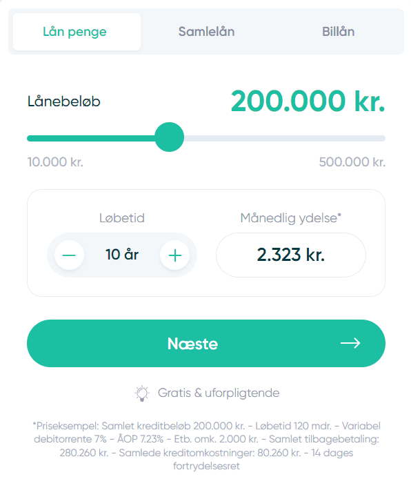 Det hele starter i den brugervenlige låneberegner, hvor du har mulighed for at skrue op og ned for lånebeløb og løbetid.