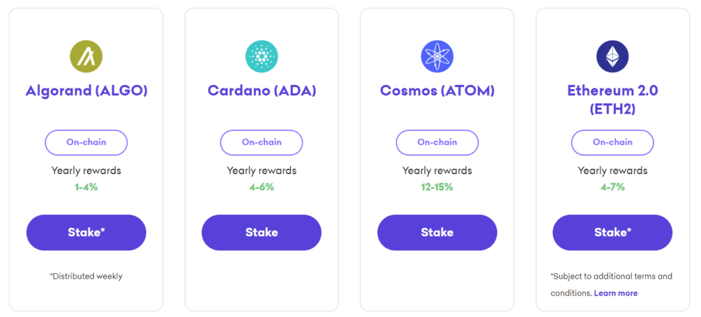 ”Staking” giver dig mulighed for at tjene renter på bestemte kryptovalutaer. Dine gevinster udbetales 2 gange om ugen, og du kan til enhver tid stoppe, hvis du ønsker at investere dine midler anderledes.