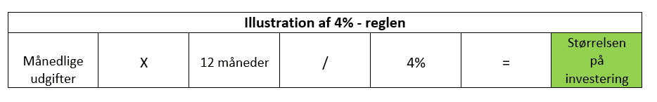 **I praksis betyder 4%-reglen, at du dividerer din årlige leveomkostninger med 0,04. **Hvis du vil leve for 300.000 kroner om året, så skal din opsparing være på 7.500.000 kroner.