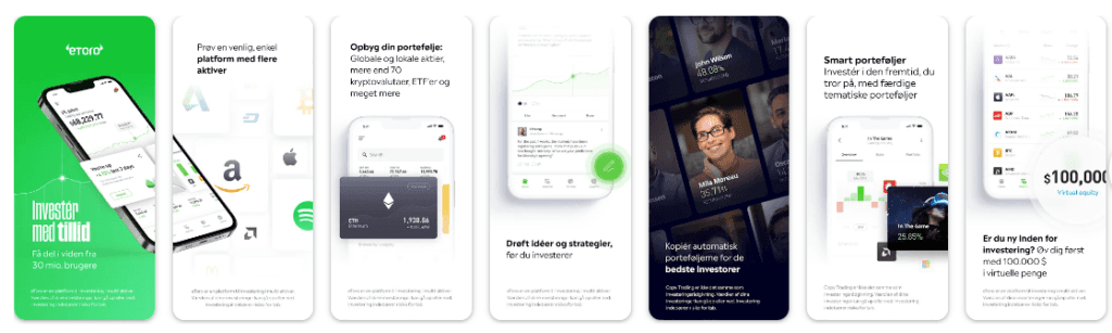 I dag kan du investere i aktier, aktier via CDF'er, ETF'er, obligationer, kryptovaluta (for eToro gælder det, at der kun kan købes kryptovaluta som CFD'er) mm. direkte fra din smartphone eller tablet.