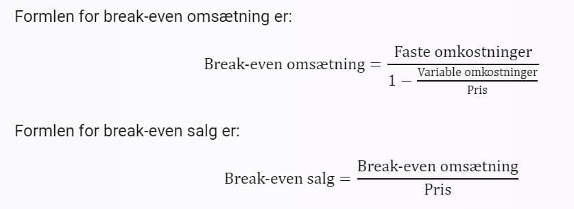 I dette eksempel betyder det, at du skal sælge 167 enheder til 100 kr pr. enhed for at dække dine faste omkostninger på 10.000 kr og dine variable omkostninger på 40 kr pr. enhed.