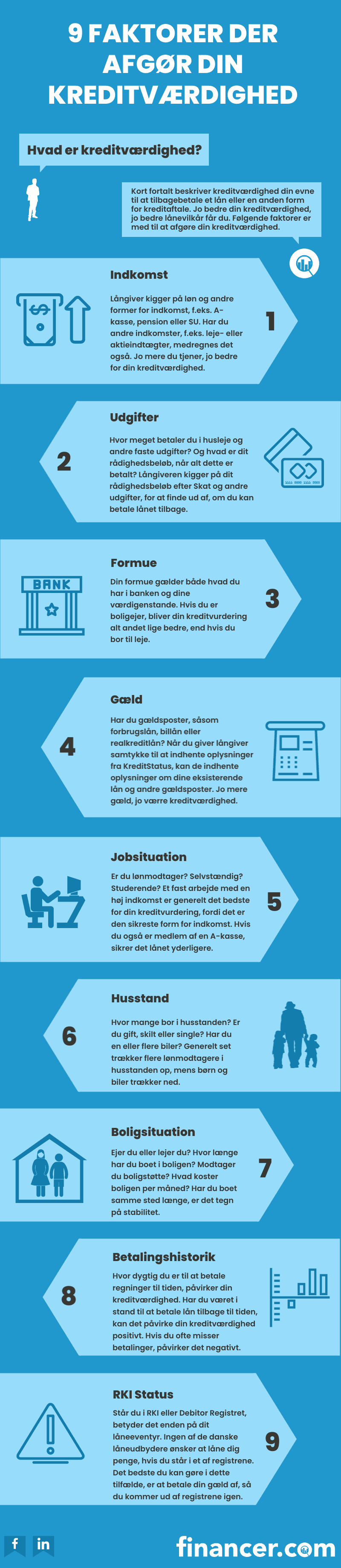 - Kreditværdighed beskriver din evne til at tilbagebetale et lån eller anden form for kreditaftale, på baggrund af din indkomst, udgifter, formue, gæld og mere.