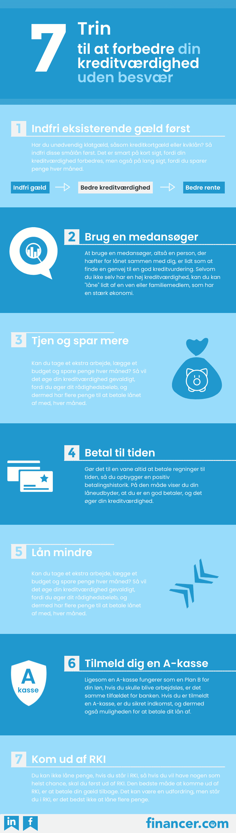 - Du kan forbedre din kreditværdighed ved at komme ud af gæld, bruge en medansøger, øge din indkomst og altid betale regninger til tiden.
