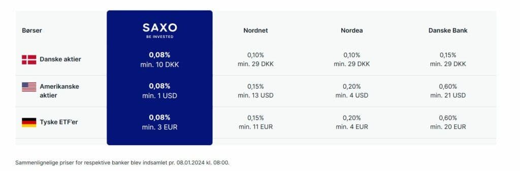 SaxoInvestor tilbyder markedsledende lave priser med 0,08% kurtage (min. 10 DKK) på både danske og amerikanske aktier. Vekselgebyret er sænket til 0,25% og blandt de mest konkurrencedygtige på markedet. Ingen depotgebyrer og gratis oprettelse.