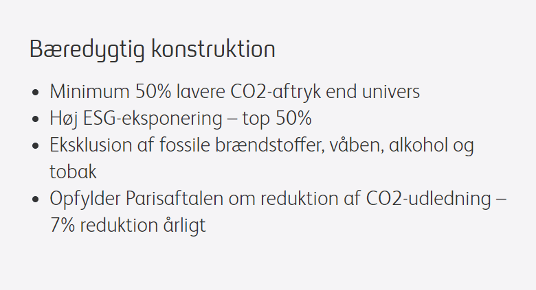 Udover Bæredygtige Global, findes også Bæredygtige Europa og Bæredygtige USA. Alle aktierne i indeksene opfylder følgende krav: