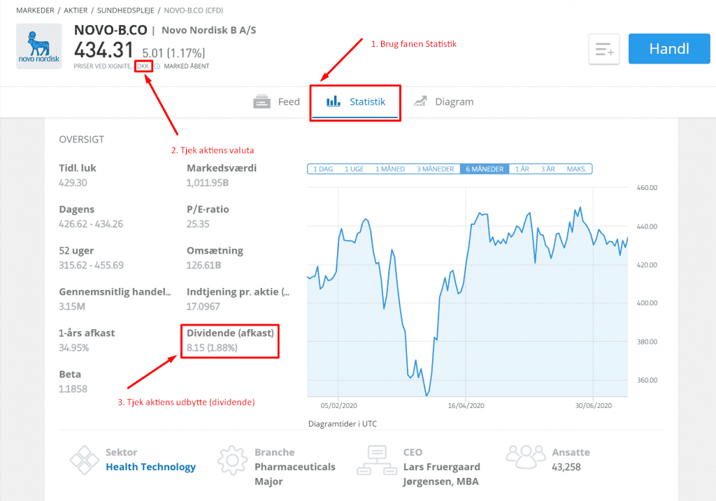 Her kan vi se, at Novo Nordisk udbetaler 8,15 kr. i udbytte per aktie per år., hvilket svarer til 1,88%. Havde aktien ikke betalt udbytte, ville der stå 0%.
