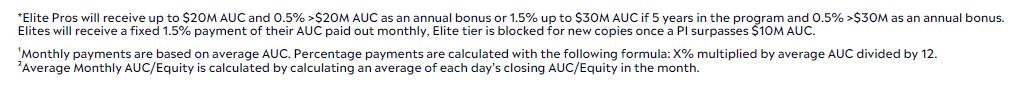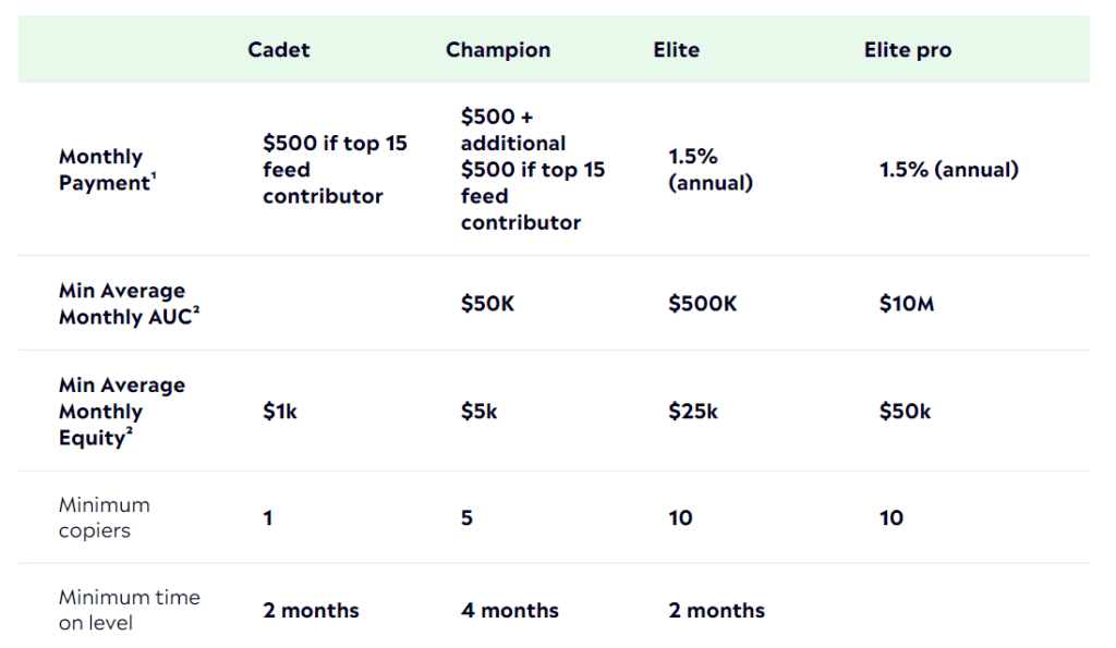Er man f.eks. Elite Investor med en AUM på $500.000, vil man tjene $7.500-$10.000 om året, afhængig af om ens AUM er vokset med mindst 1% hver måned eller ej.