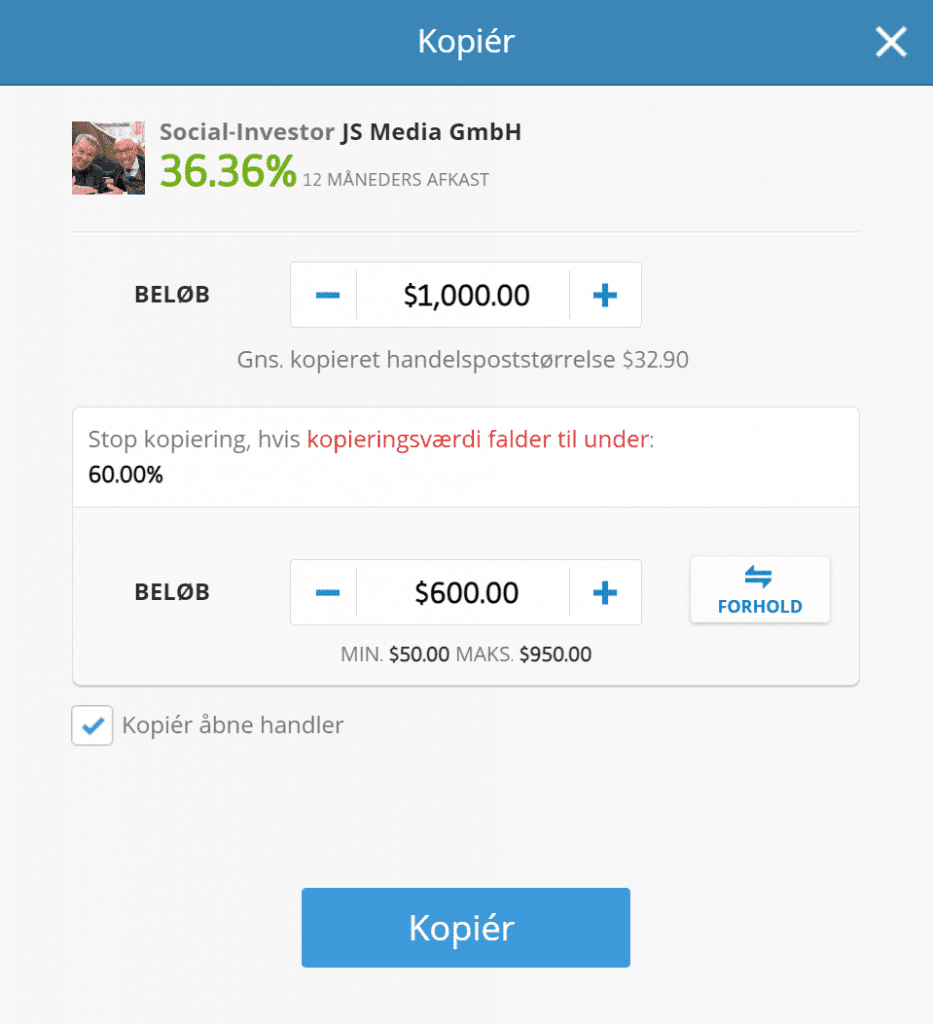 Du skal som minimum investere $200 per investor og mindst $1 i hver kopieret handel. Du kan højst investere $500.000 i en investor.